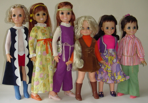 Several Crissy family dolls modeling the 1971 JCPenney outfits. The purple pantsuit is the American version of an Eaton's catalog outfit, page 2. This one is a bit darker and has a finer knit pattern to it. |