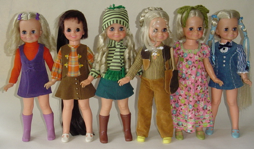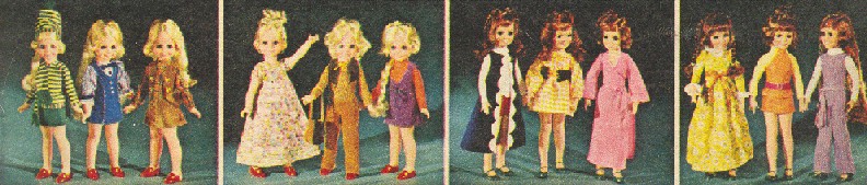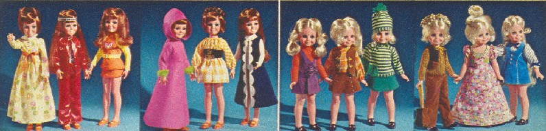 From 1969, when Crissy was originally sold, until 1971, there were no catalog exclusive outfits sold for the doll line. While there was nothing "Crissy" sold in the 1969 book, the 1970 book sold a number two Crissy in the orange lace issue dress, hair to her bum. The 1971 book offered a Beautiful Crissy, Gorgeous Tressy and a Velvet doll (purple a-line dress). Finally, in 1972, a collection of exclusive clothes were sold....