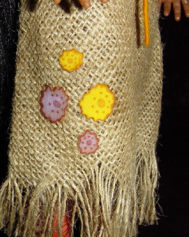 Here is a nice detail shot of the appliques' (generally missing) from Burlap Bag. The choker above is a reproduction. The color is right but it should be made of a very thin rope-like strand. It is visible in my MIP example.
