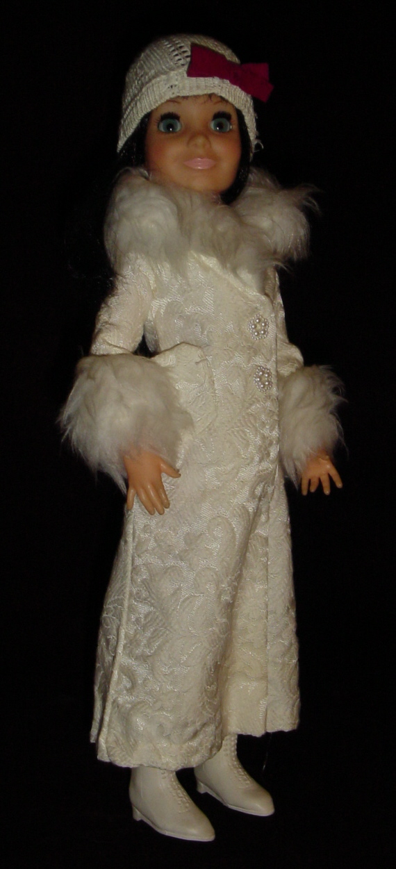 Hippie Happening is just so sweet on this minty mint Kerry doll. The yarn belt is original to the dress. It is made rather uniquely from real wool yarn. There are no known variations found in this belt and will be found only as shown above.