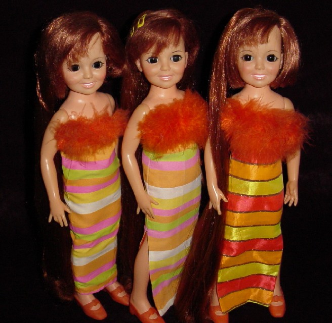There were three variations of the 1969 Sears Catalog Exclusive gown. Modern-day collectors call it the "marabou" gown. The first version is a very rich fabric with gold threads running horizontally through it. It is lined with orange fabric. The second version is made identically except the outer fabric is a cheaper striped fabric. It is lined as well. The third version is a simple tube, made of the same fabric as the second one, but it is not lined. It is the cheapest and most inferior of the three. It would only be appropriate to put this dress on a hair-to-the-floor doll, as it was sold no other way, than in her box from Sears.