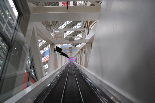 Here is the really long escalator. It is the longest and tallest free-standing escalator in the world. It takes two and a half minutes to ride the entire length. It is a full eight stories high!