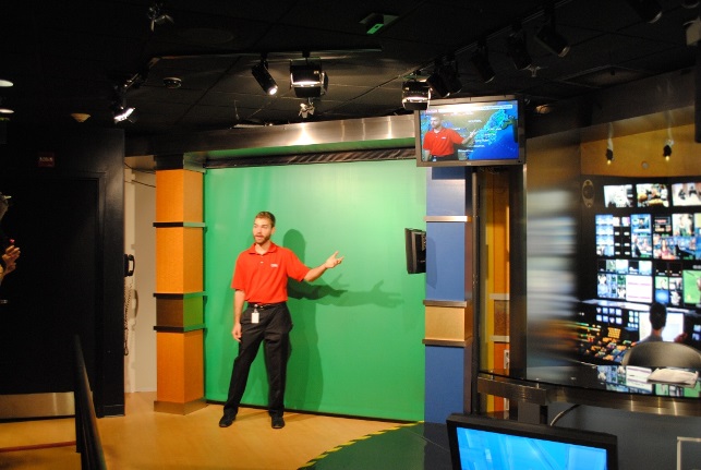 We had our own personal tour guide just for our group. Beth bought out all of the tickets so that no one would be joining us that we didn’t know [giggle]. Some things we were NOT allowed to photograph, like the sound stages that were broadcasting live, so there are no pictures of that. After that though, our guide took us in a mock-up of a broadcast studio, complete with a camera, teleprompter, wall monitors, green screen, and a weather report! Our friend Cindy volunteered to read “news” on the scrolling feed of the teleprompter. Vacation Crissy joined her at the news desk. Cindy ACED the reading! She was amazing!