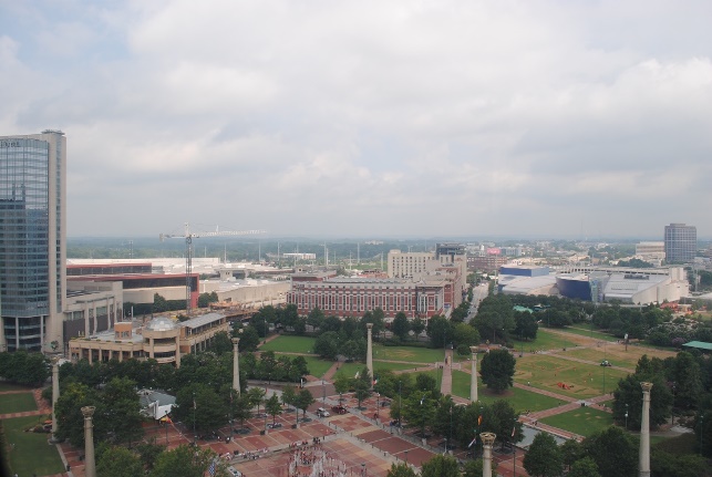 This is Centennial Olympic Park in downtown; that is a fountain in the center that the kids like to play in. Can you tell how high up we are??
