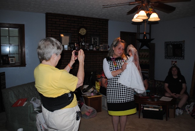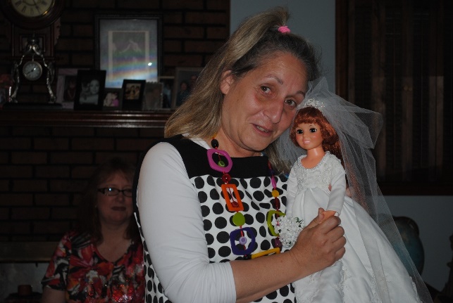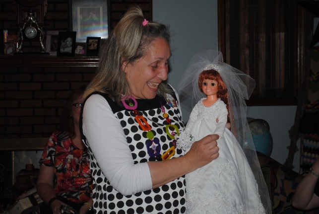 After all of the fun and games and prize-winning, to wrap up the day, we give away a bride doll, and Crissy was beautifully dressed in an ensemble by Georgia. Drumroll please... Beth puts her hand in the bowl and stirs the names around…. And the winner is…. CINDY!!