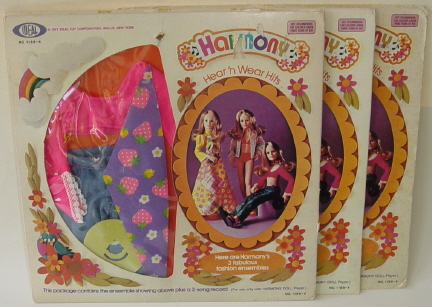 Harmony's three outfits were sold in packaging that was the exact size of a standard record album! She had three outfits: "Bikini Beat," "Meadow Music" and "Rehearsal Rags." No shoes were ever sold for her in alternate colors. The only shoes that the collector will find Harmony wearing (that fit correctly anyway) are her issue burgundy colored sandals.