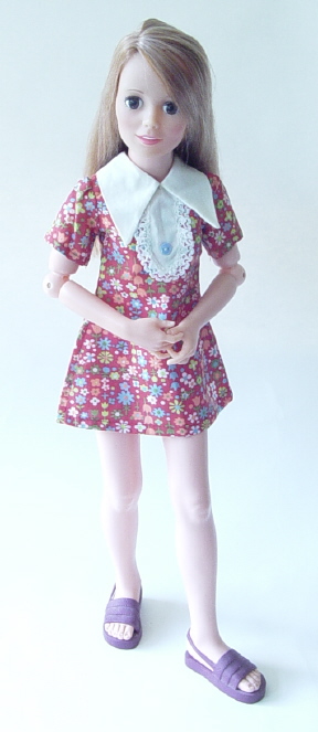 In 1972, the Wards Toy Catalog offered five outfits that look so precious on Harmony. Here is a blue dress offered in the set. The little pin is a "bubblegum" pin, very cheaply made and was added by a child somewhere along the way. How charming!