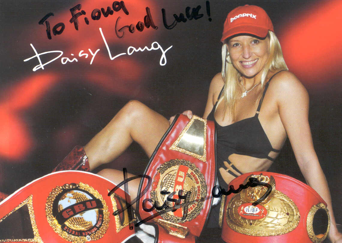 I love Jackie and I also met her lovely friend Daisy “The Lady” Lang, a three time world boxing champion from Germany. Daisy autographed a photo of her with her belts, also in my box! As you can see from her photo Daisy would be a nice lady to know in a dark alley!
