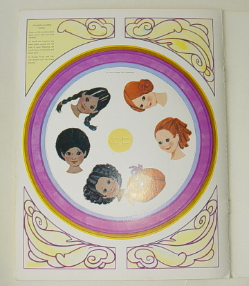 This is inside the back cover. It is called the Change-a-Hairdo Wheel. The child would attach it to the inside of the front cover to see what the paperdoll might look like with a different hairdo. Very innovative!