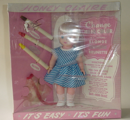 Created by the Natural Doll Company, Honey Claire was unique in that her hair could be "colored" different shades. She could be blonde, a redhead, or brunette. The young stylist changed the doll's hair color with pens that contained the hair-color. What a fun hair play doll!