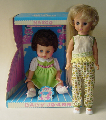 When one purchased Jo Ann from a location other than Wards, she could be found in any number of outfits. Here she is in one of them, right next to her "baby self." Baby Jo Ann didn't grow hair. What a shame!