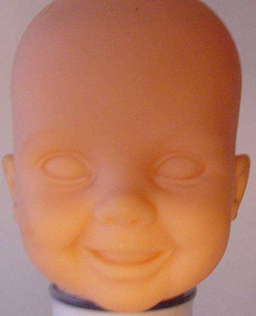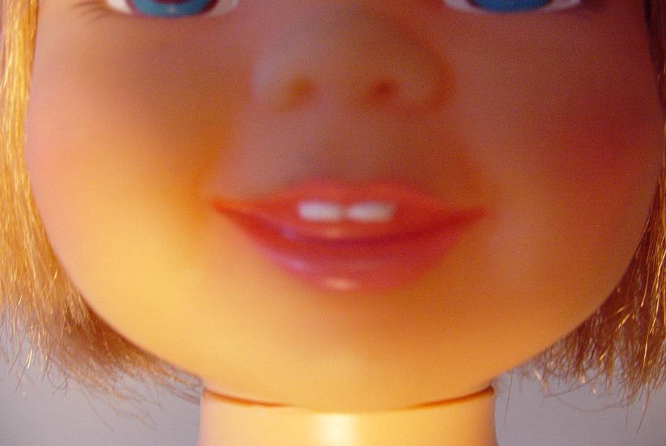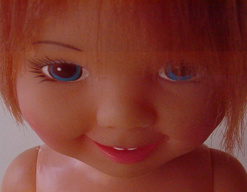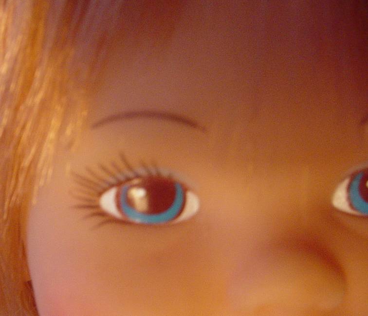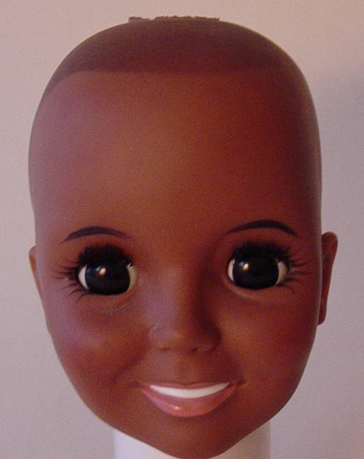 I own another prototype that also is not marked Hong Kong. It’s an extremely early piece, a black Crissy doll head. Her lips and teeth appear to be painted in the usual way (with a template and an airbrush) but her eyes are painted by hand, quite beautifully, one might add. There are seven large brushstrokes on each eye that create her eyelashes (the hand painted lashes) and the eyebrows are artfully painted with several brushstrokes. Like Rusty, she does not have hair rooted in place, nor does she have “follicles” for hair. After some consideration, I am of the opinion that Ideal was finalizing how Crissy’s eye make-up would look before she was mass-produced. This doll head, like all Crissy heads, is marked 1968, a year before she was released for sale. Which stands to reason… it takes about a year for a concept to become reality in the toy world and naturally, they would start with Crissy’s face.