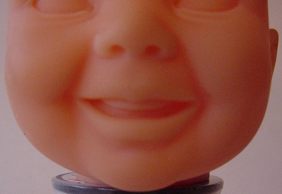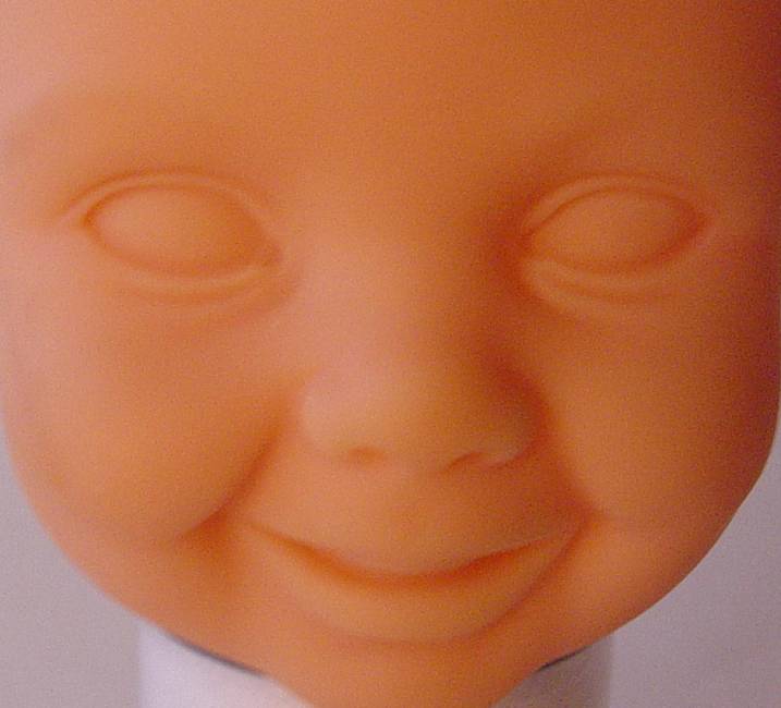 Rusty is very much different than the final product that we know as Cinnamon. There is considerable sculpting, two lines below her eyes, that the final doll does not have. Using a caliper to measure the width of her cheeks, Cinnamon is chubbier. Rusty has laugh lines! Rusty’s chin is much more defined. And finally, Rusty does NOT have individual teeth like Cinnamon does. One can run their fingernail across Cinnamon’s upper teeth and feel the definition between the two. Rusty has a single ridge along the top of her mouth where her teeth would be. It appears that Rusty has more “teeth” than Cinnamon. Overall, Rusty’s head is smaller and not as round as Cinnamon.