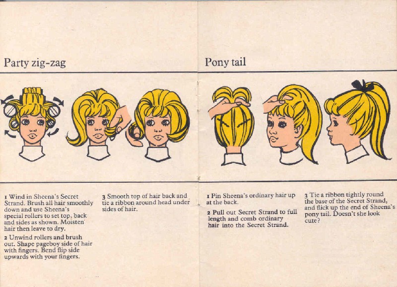 Sheena's booklet that illustrates her hairstyles is quite unique! There are alot of styles to choose from and they all have very interesting names. Take a moment to read the booklet. It calls her growing hair a Secret Strand. And the hair that Ideal literature called Foundation Hair is called Ordinary Hair in this Palitoy, Ltd. booklet. How fun!