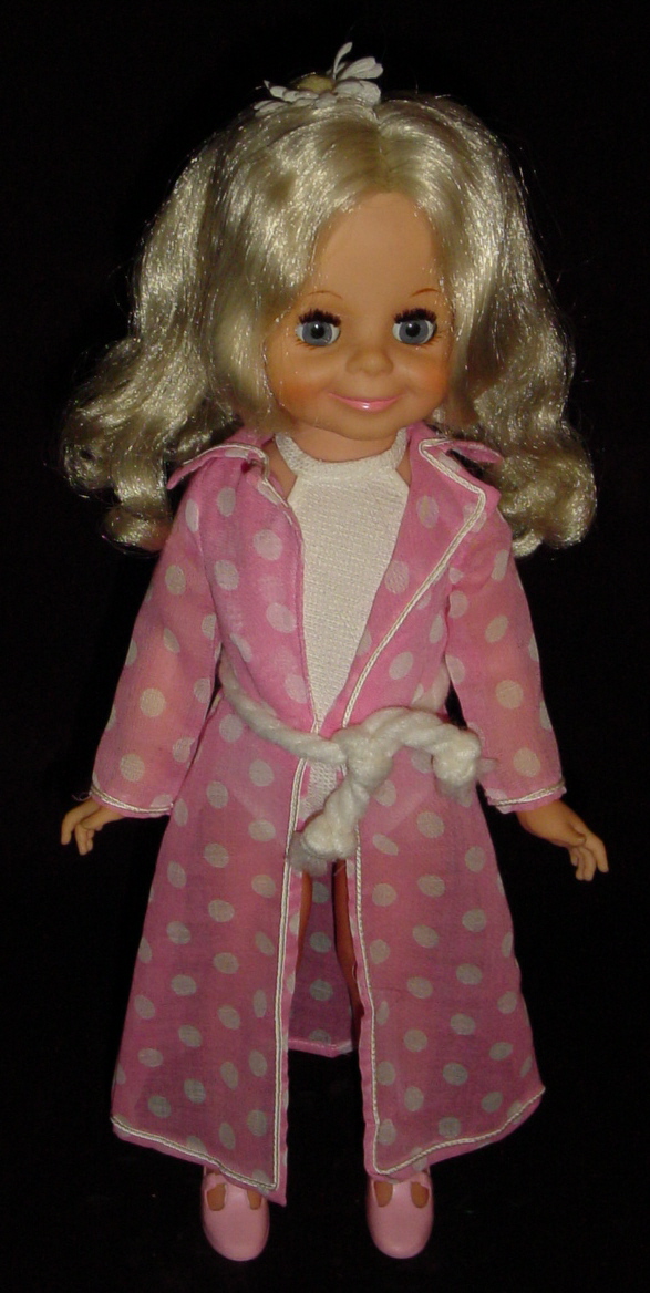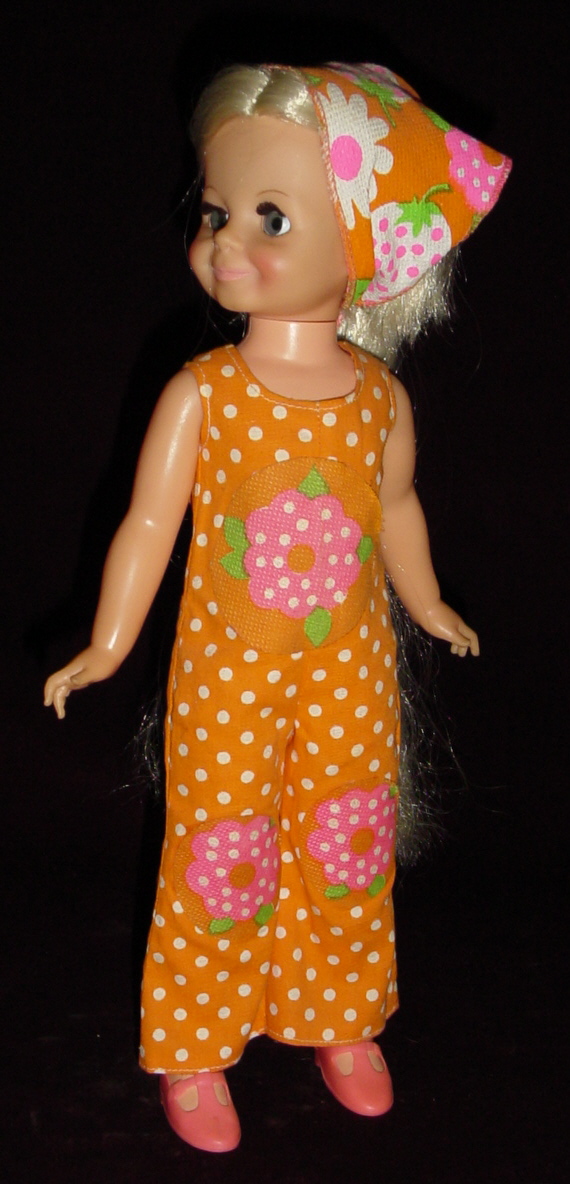Beachnik was comprised of a one piece bathing suit, halter style, and a long cover-up that tied with a white yarn tie. The daisy in her hair actually was sold in a Sears catalog, included in a small haircare set.