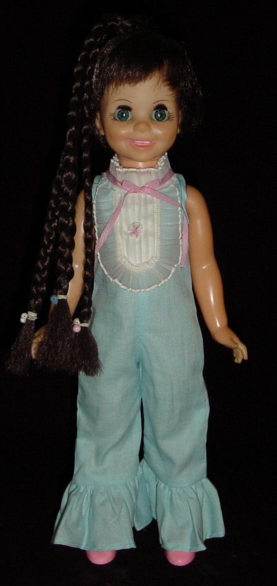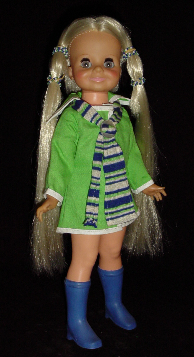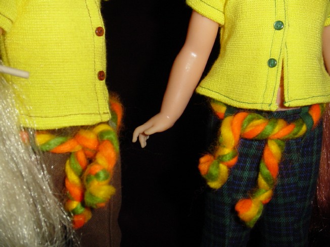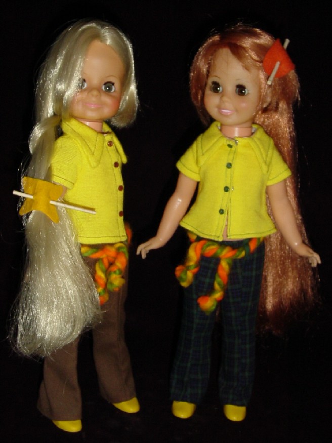 There is an unusual variation of Smarty Pants, found on occasion. Instead of brown pants, one might find it with green/navy plaid pants. The yellow top is top-stitched in green and has green buttons instead. What a nice variation for one's archive! Note: the hair clips are part of a Sears hair-care set.