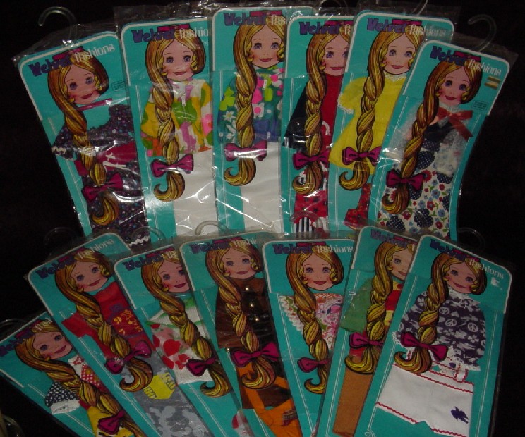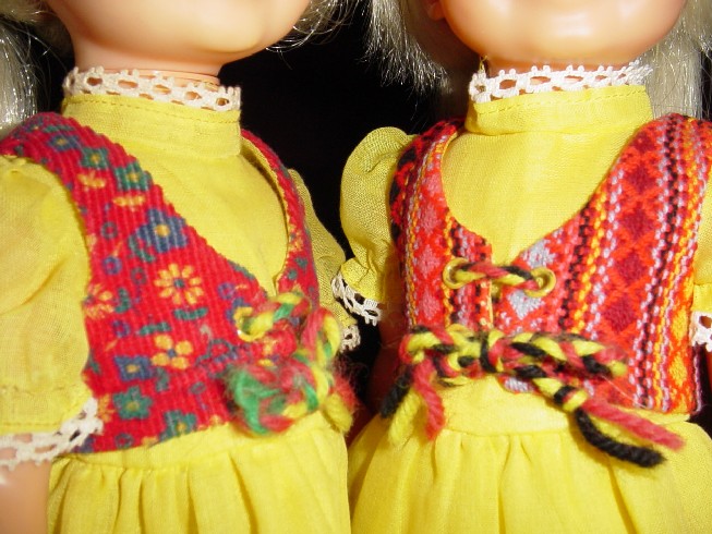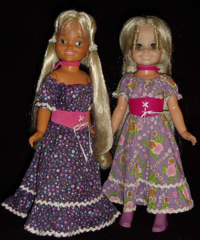 Lovely in Loverly, this outfit changes names the next production year. On the right you will see a pale Velvet doll that hails from Australia (a typical problem with dolls from Oz is inferior vinyl causing them to fade badly). She is wearing a version of Loverly that was sold "down under."