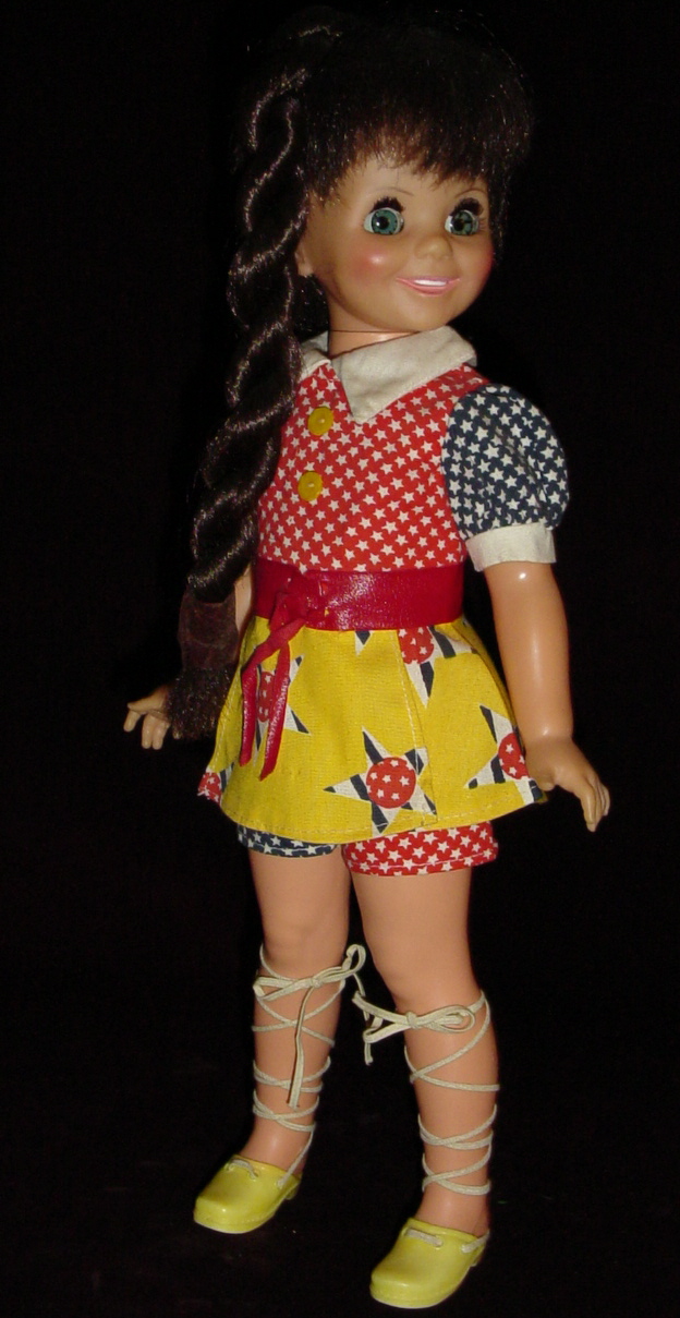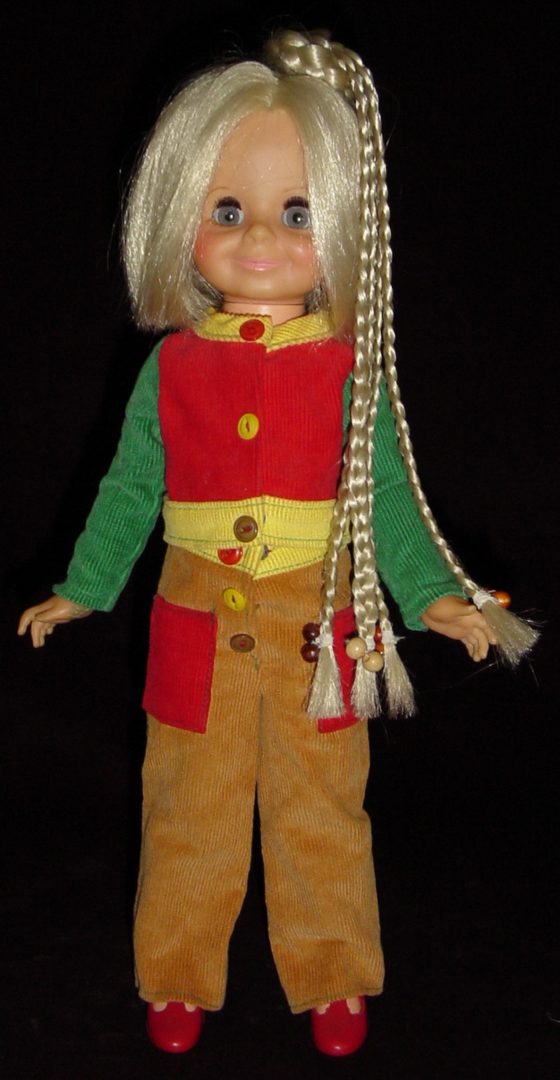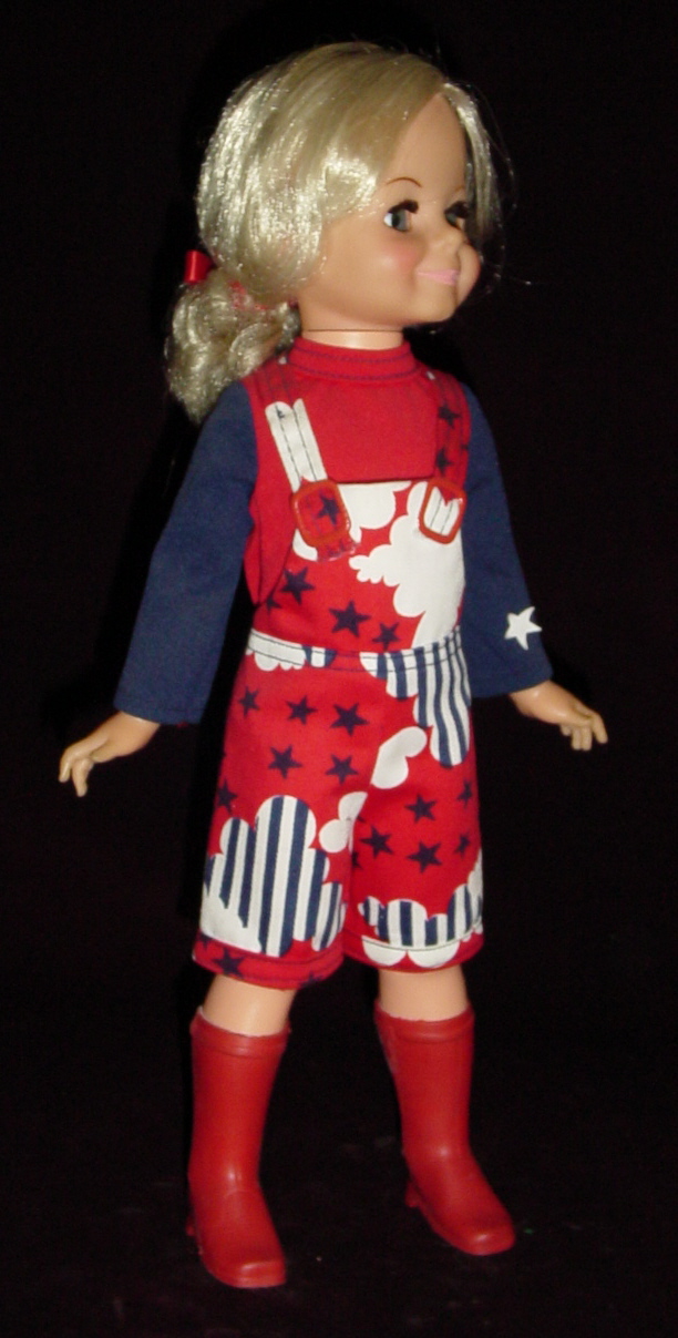 The advanced collector will find that Dandy Denims was sold with two different types of jeans. The iron-on decals were the same, but one will be dark navy blue and the other is a light "denim" with a bleached effect. The hair items are original to the outfit.